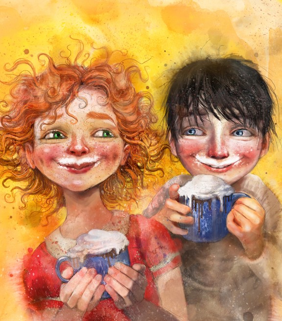 Teksten bryter med prinsippet show, don’t tell – og illustrasjonen som er tett på ansiktene til de to vennene med hver sin kakaokopp, overlater lite til leseren.