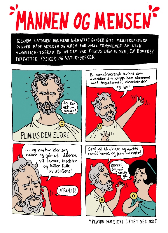 Dette er mitt eneste ankepunkt. For resten av boka gjør en god jobb for å få bukt med fordommer som dette. Det fungerer veldig godt når tegneserieskaper Jenny Jordahl, med en god dose humor og ironi, avslører blant annet samfunnets trangsynthet, bind- og tampongindustriens dårlige salgstriks, menns forvirrede forhold til mensen, samtidig som hun kommer med litt generell folkeopplysning.
