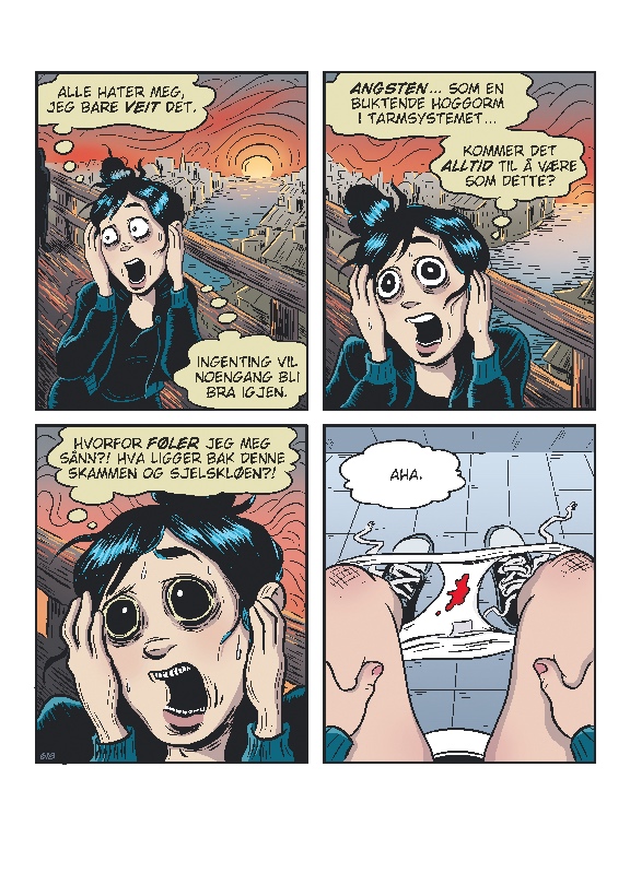 Mari Kanstad Johnsens illustrasjon fremstiller pms som en apokalypse. Hos Lina Neidestam blir karakteren Zelda til et Hulkenlignende monster den uken hun har mensen. I et annet bidrag fra Neidestam, som spiller på motivet i Edvard Munchs «Skrik», fortviler en kvinne: «Hvorfor føler jeg meg sånn?! Hva ligger bak denne skammen og sjelskløen?!». At forklaringen i siste rute viser en truse med mensblod i, blir litt platt og forutsigbart sammenlignet med de andre bidragene.