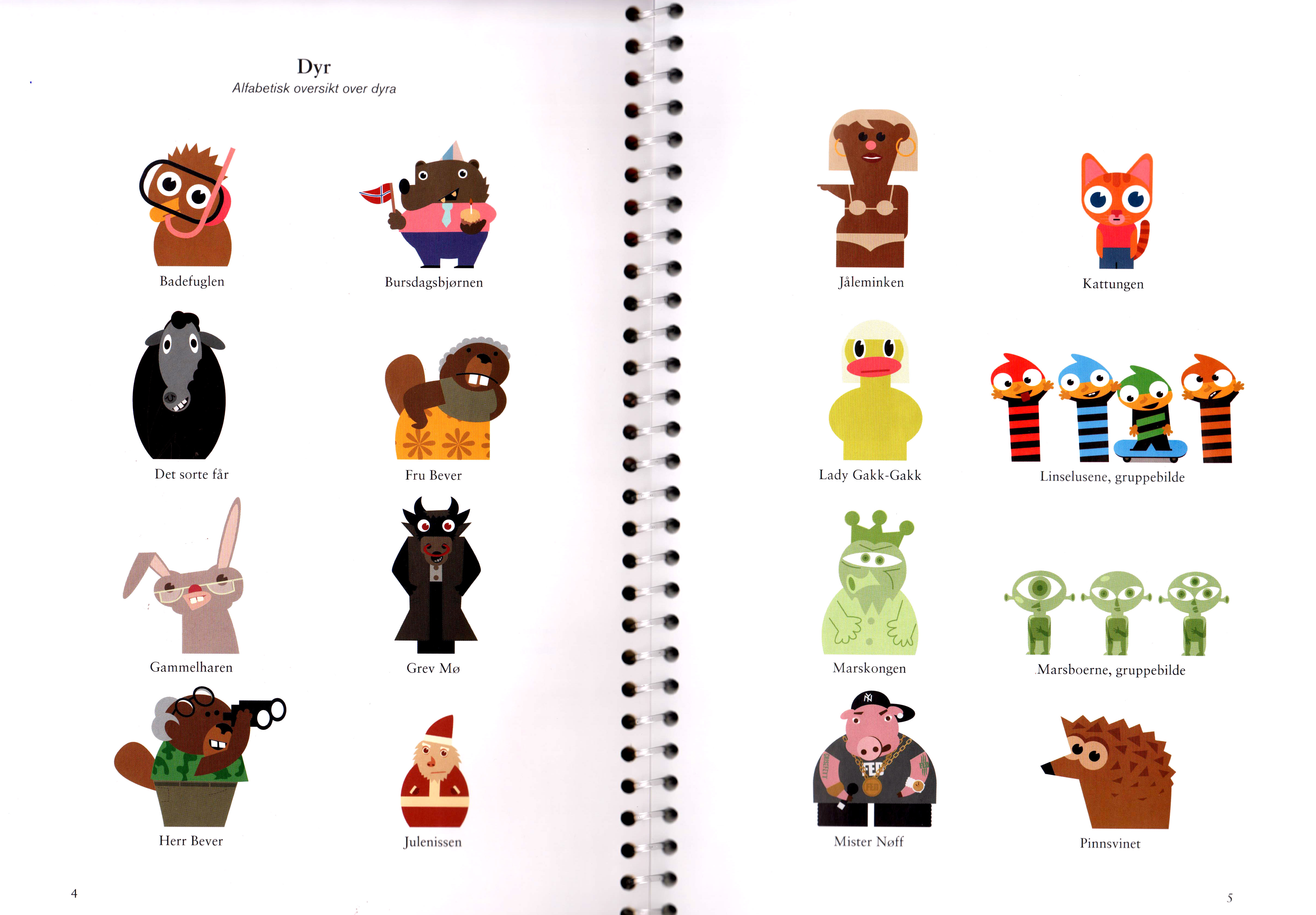 Figurene til Aalbu er enkle og klare, dominert av stiliserte, rene flater. De fleste figurene har entydelig, tegneserieaktig identitet; De er typer, noe som ganske sikkert gjør det lettere å lage historier om dem. Som for eksempel Rumpestangeren, en slags okse som elsker å stange de andre dyrene i rumpa, med eget kamprop til og med (Stanguuuuu!). Av andre i persongalleriet kan vi nevne: Pinnsvinet, den litt skumle, vampyr-aktige oksen Grev Mø, Ugle Bugle, Linselusene og Lady Gakk-gakk. For alle med dragning mot sci-fi, følger med en ganske rikholdig gjeng av forskriftmessig grønne marsboere, komplett med UFO-kulisser.