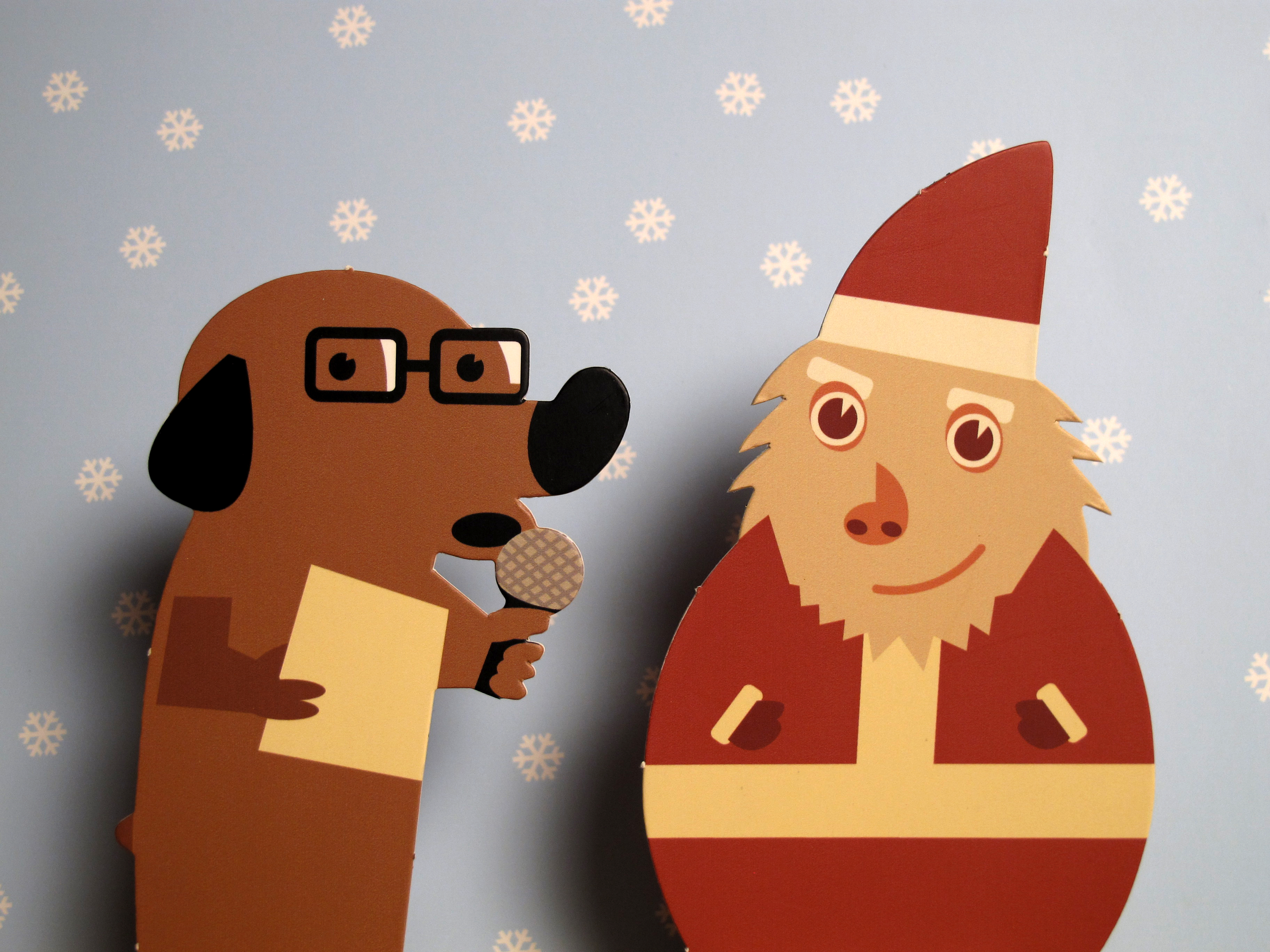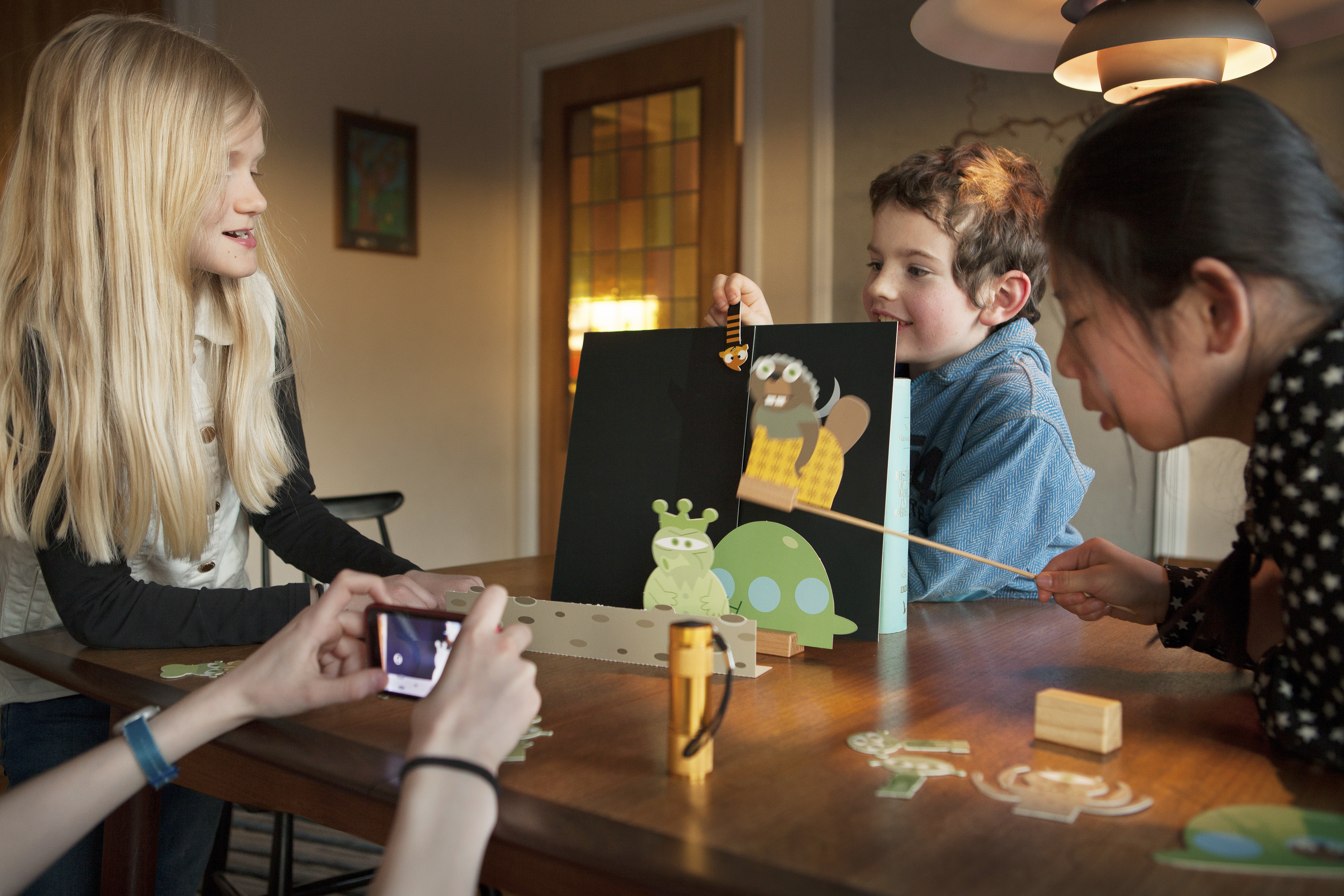 For riktignok finnes det en bok i haugen, men det er også mye mer: Kartonger med utstansete figurer, flere av samme slag, til og med. Kulisser. En slags stenger av tre, åpenbart til å operere figurene med? Men som så ofte er forvirringen et søskenbarn av oppfinnsomheten og nysgjerrigheten, og etter litt detektivarbeid og en smule lesning i den boken som tross alt er med, går det opp et lys: Film et dyr er et gjør-det-selv-dukketeater, beregnet på å filmes med mobiltelefon!